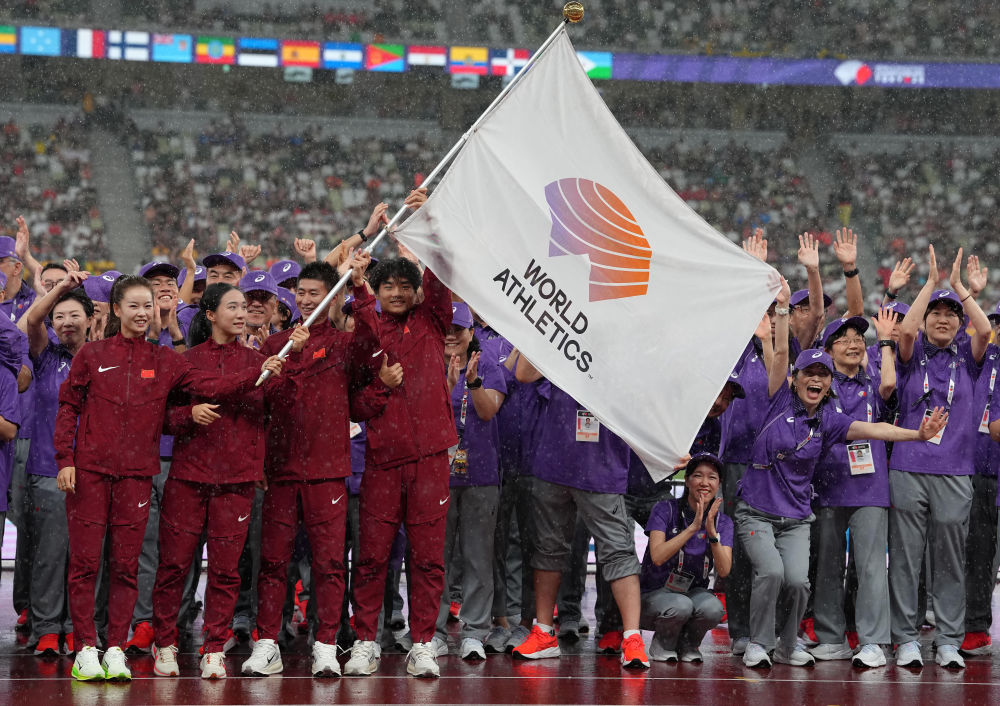 这是在2025年世界田径锦标赛上拍摄的世界田联旗帜会旗交接仪式现场。新华社记者 鞠焕宗 摄