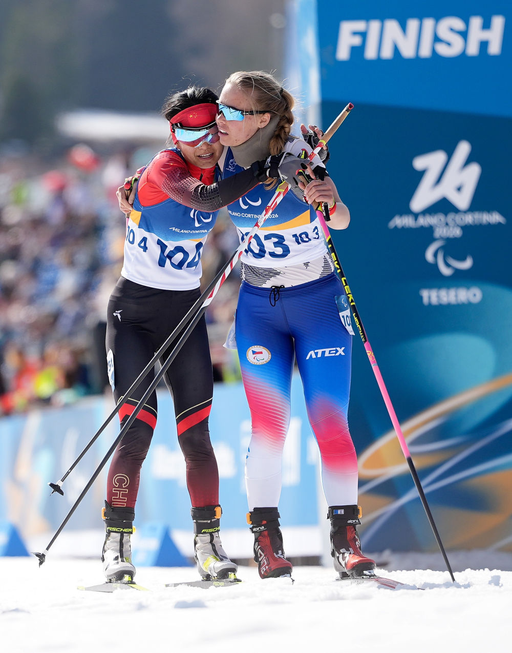 3月13日,中国选手王跃(左)在比赛后与捷克选手卡丽娜·埃德林格罗娃拥抱。 当日,在意大利泰塞罗举行的米兰-科尔蒂纳冬残奥会冬季两项女子短距离追逐(视障)比赛中,中国选手王跃获得亚军。新华社记者 侯昭康 摄