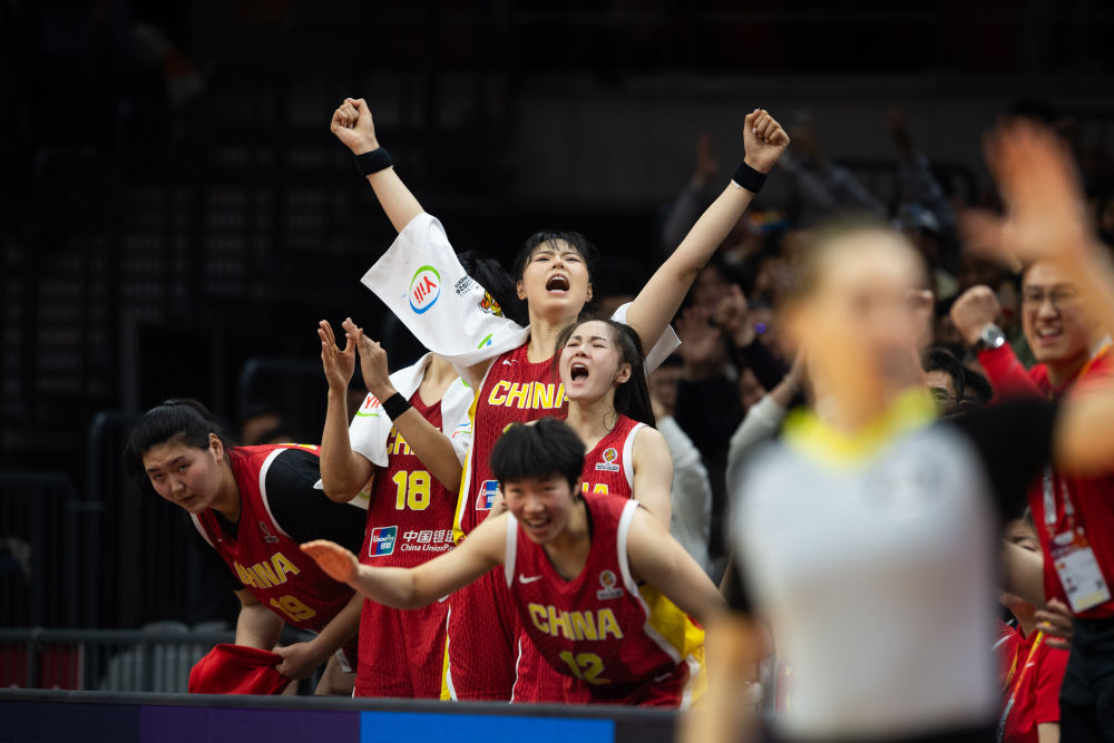 3月15日,在武汉举行的2026年女篮世界杯资格赛A组比赛中,中国队84:74战胜捷克队。图为中国队球员在场边庆祝得分。新华社记者 肖艺九 摄