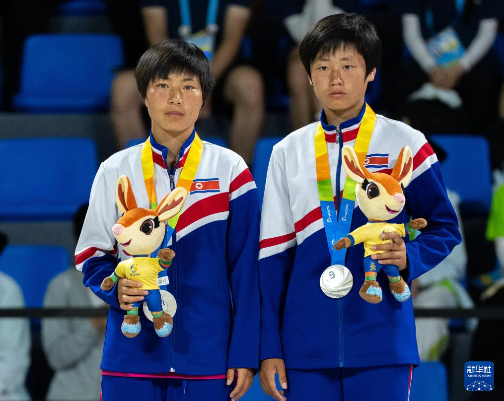 4月27日,亚军朝鲜组合金孝庆(左)/车雪庆在颁奖仪式上合影。