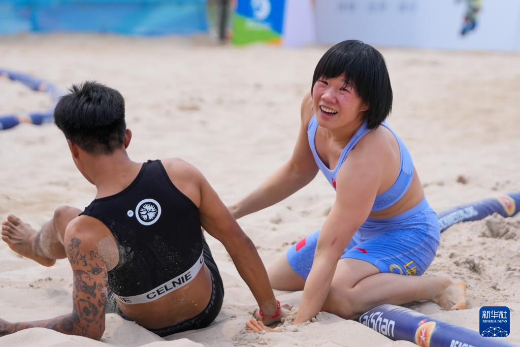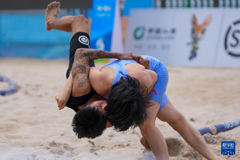 4月28日,在海南三亚举行的第六届亚洲沙滩运动会沙滩摔跤女50公斤级资格赛中,中国选手梁锦月战胜柬埔寨选手桑南·迪。