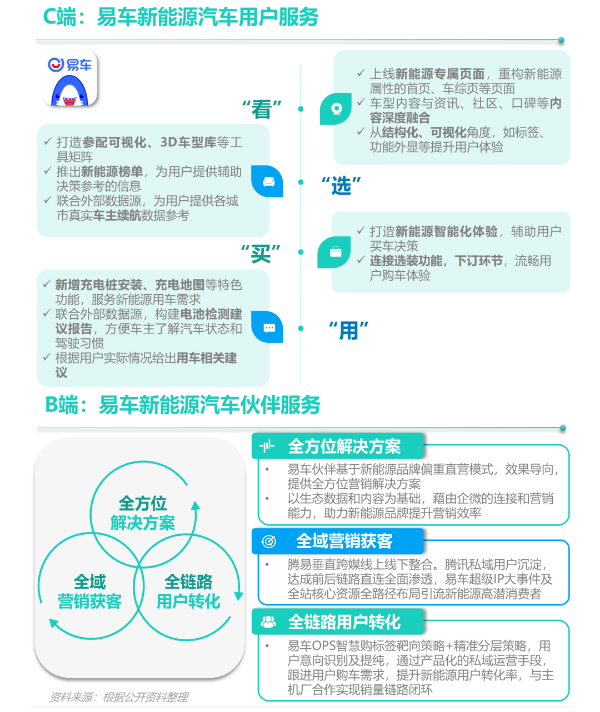 近年来,在汽车产业“新四化”驱动下,新能源汽车发展势头迅猛,易车加速入局“卡位。基于用户对新能源的认知和需求升级,易车积极布局新能源汽车的内容、工具、服务,从“看、选、买、用”层面全面提升用户的新能源汽车体验。同时,为厂商、经销商提供全方位解决方案、全域营销获客、全链路用户转化的一站式服务。