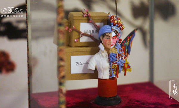 面塑俗稱面人,因為它主要的題材都是人物,所以老百姓們也管它叫面人。這個是“三八婦女節(jié)”那天做的,我看到當時有很多的醫(yī)護人員作為人類的代表跟另外一個物種去斗爭、保護我們,覺得她們還真的是很了不起的。想到以前巾幗英雄里邊穆桂英這個角色,加上京劇也是我們傳統(tǒng)文化中很寶貴的一個部分,就把這兩個結合在一起做了一個拼臉。