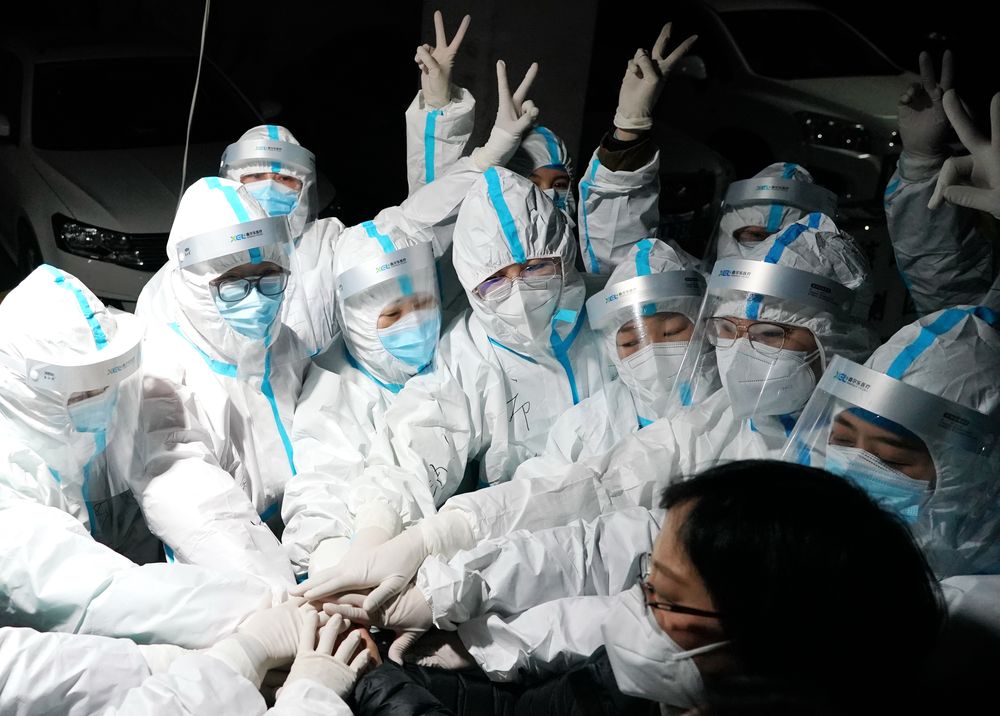 ↑1月7日,在石家莊市裕華區(qū)九里庭院社區(qū),醫(yī)務(wù)人員開展核酸檢測(cè)前相互加油鼓氣。