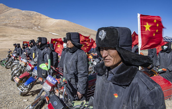 西藏日喀則市薩嘎縣昌果鄉(xiāng)的一處村莊里,48歲的藏族漢子石覺塔布在風(fēng)中跨上一輛摩托車,向平坦無垠的高原邊緣騎去。他的車尾插著一面五星紅旗,被風(fēng)吹得獵獵作響,即便駛出很遠(yuǎn),那抹紅色在車輪卷起的煙塵中也依然醒目。