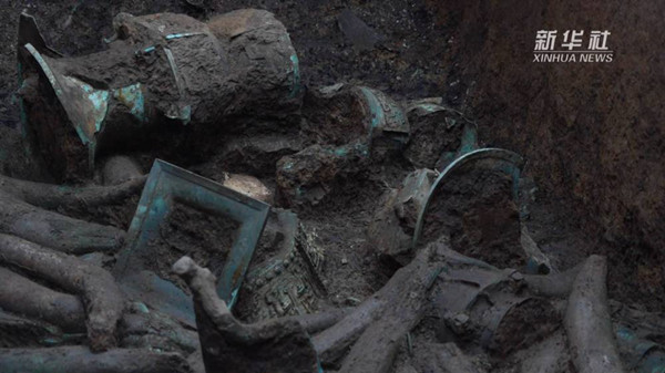 此次新發(fā)現(xiàn)的6個坑狀祭祀遺跡在第1、2號祭祀坑旁。面積僅3.5平方米的5號祭祀坑內(nèi)一片金光閃閃,已清理出多件金器、玉質(zhì)管珠和象牙飾品等。正在發(fā)掘的3號祭祀坑每天都有新發(fā)現(xiàn),6號祭祀坑確認(rèn)一具“木匣”,長約1.5米、寬約0.4米,木匣內(nèi)外均涂抹朱砂,目前尚不能確認(rèn)其用途。