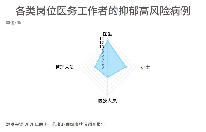 ????? 《中國國民心理健康發(fā)展報告(2020)》分報告《2020年醫(yī)務(wù)工作者心理健康狀況調(diào)查報告》對我國2466名醫(yī)務(wù)工作者進行了調(diào)查。調(diào)查發(fā)現(xiàn),有27.7%的醫(yī)務(wù)工作者可能存在抑郁傾向,在不同崗位上的醫(yī)務(wù)工作者存在較高抑郁風(fēng)險的比例為5.1%到12.8%不等。其中,醫(yī)生是風(fēng)險比例最高的群體,其次是護士群體,其抑郁高風(fēng)險比例為9.0%。