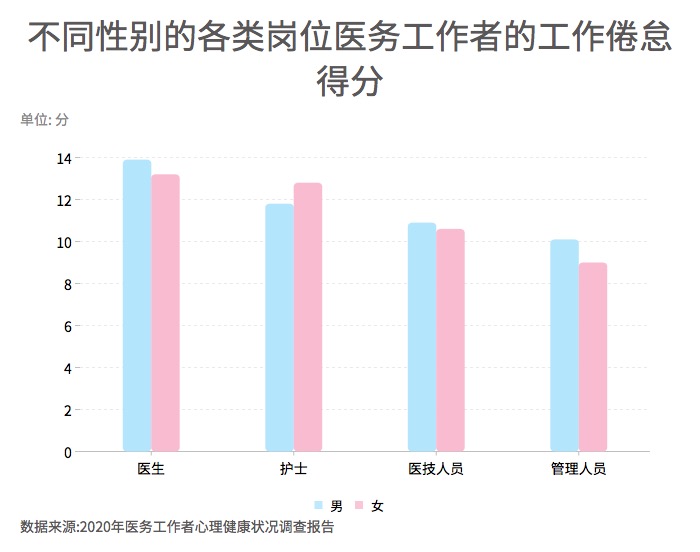 ?????? 根據(jù)調(diào)查,醫(yī)生的工作倦怠得分高于護士、醫(yī)技人員和管理人員。在醫(yī)生、醫(yī)技人員、管理人員三類崗位中,男性醫(yī)務(wù)工作者的得分均高于女性; 在護士群體中,女性的得分高于男性。