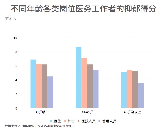 ????? 根據(jù)報告顯示,男性醫(yī)生的抑郁得分為8.4分,女性醫(yī)生的抑郁得分為6.9分; 男性護士的抑郁得分為7.5分,女性護士的抑郁得分為6.7分;男性醫(yī)技人員的抑郁得分為 6.4分,女性醫(yī)技人員的抑郁得分為5.8分, 男性管理人員的抑郁得分為6.1分,女性管理人員的抑郁得分為4.5分。其中,各個崗位的男性醫(yī)務(wù)工作者的抑郁得分都高于女性醫(yī)務(wù)工作者。