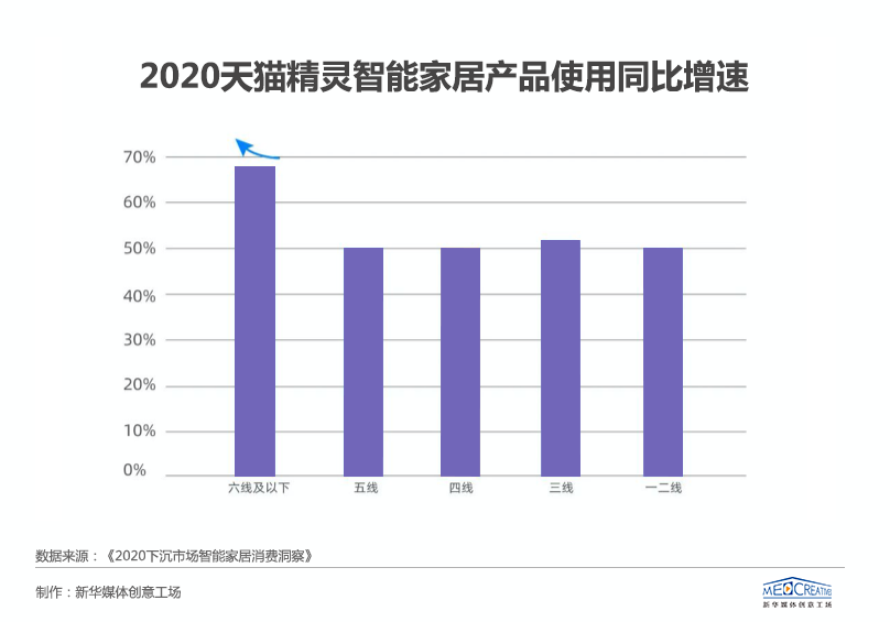 根據(jù)《2020下沉市場智能家居消費(fèi)洞察》顯示,50%以上的天貓精靈智能家居使用者在三到六線城市,其中六線城市用戶增速最快,四線城市銷量、銷售額增長最快,下沉市場正在成為智能家居行業(yè)的新藍(lán)海。同時,根據(jù)天貓平臺數(shù)據(jù)顯示,智能開關(guān)、智能落地?zé)簟⒅悄茈娬粝涞葍r格在50元到300元之間的小家電,在下沉市場年銷量同比增速均超過300%,也側(cè)面佐證著這一現(xiàn)象。