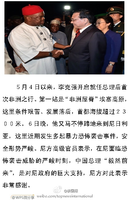 ????新華網(wǎng)北京5月7日電 據(jù)新華社“新國際”微博報道,5月4日,李克強開啟就任總理后首次非洲之行。繼首站訪問條件艱苦、發(fā)展落后的“非洲屋脊”埃塞高原后,6日晚,他又馬不停蹄地來到面臨恐怖襲擊威脅的尼日利亞。尼方高級官員表示,中國總理“毅然前來”,是對尼政府的巨大支持,尼方對此表示非常感謝。
