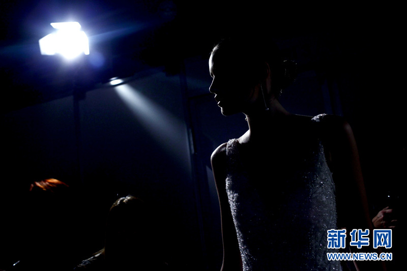 場外正在準(zhǔn)備登臺展示婚紗的模特。