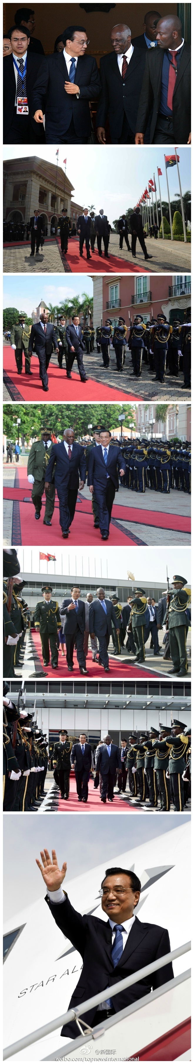 ????新華網(wǎng)北京5月10日電? 據(jù)新華社“新國際”微博報(bào)道,當(dāng)?shù)貢r(shí)間9日下午,李克強(qiáng)總理結(jié)束了在安哥拉的密集訪問行程,安總統(tǒng)多斯桑托斯夫婦在總統(tǒng)府為李克強(qiáng)夫婦舉行歡送儀式,安副總統(tǒng)維森特和外長??频俚綑C(jī)場為李克強(qiáng)夫婦送行。