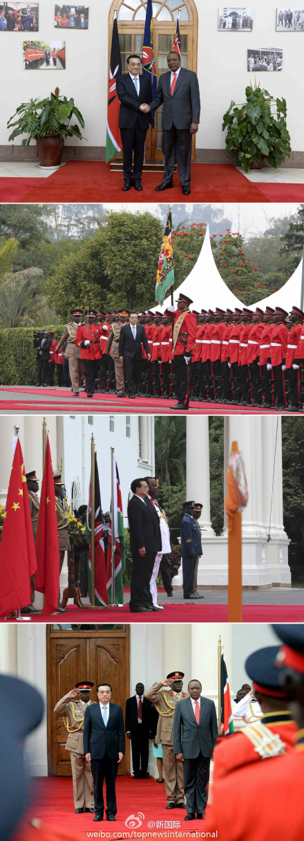 ????新華網(wǎng)北京5月10日電? 據(jù)新華社“新國際”微博報道,肯尼亞總統(tǒng)肯雅塔10日上午在國家宮為中國總理李克強舉行隆重歡迎儀式?,F(xiàn)場鳴放禮炮,軍樂隊奏兩國國歌。李克強檢閱了儀仗隊。