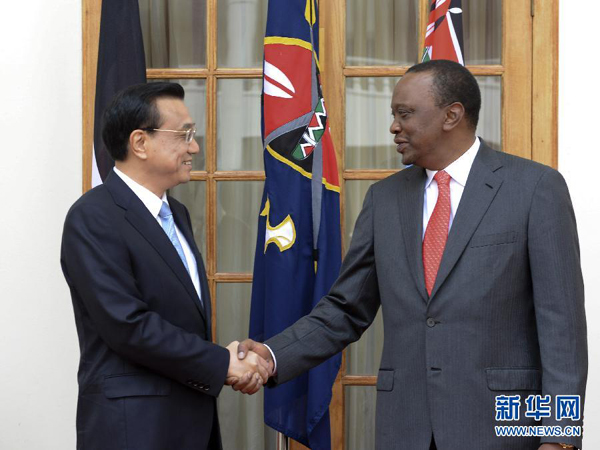 ????肯雅塔代表肯尼亞政府和人民熱烈歡迎李克強(qiáng)訪肯,表示在周恩來(lái)總理訪非50周年之際,李克強(qiáng)總理對(duì)非洲進(jìn)行的里程碑式訪問(wèn)取得圓滿成功,將進(jìn)一步深化非中新型戰(zhàn)略伙伴關(guān)系??现杏兄嗤臍v史遭遇和發(fā)展任務(wù),肯方感謝中方對(duì)肯經(jīng)濟(jì)社會(huì)發(fā)展和保護(hù)生態(tài)環(huán)境、野生動(dòng)物資源的幫助和支持,高度贊賞中國(guó)為維護(hù)非洲和平與發(fā)展作出的重要貢獻(xiàn),完全贊同李克強(qiáng)總理在非盟演講中提出的“461”非中合作框架和在世界經(jīng)濟(jì)論壇非洲峰會(huì)特別致辭中提出的合作建設(shè)非洲基礎(chǔ)設(shè)施“三大網(wǎng)絡(luò)”的主張,愿與中方加強(qiáng)戰(zhàn)略溝通,全面推進(jìn)各領(lǐng)域合作,實(shí)現(xiàn)共同發(fā)展??戏皆缸鲋袊?guó)企業(yè)進(jìn)入非洲的門戶,為推動(dòng)非中合作發(fā)揮積極作用。