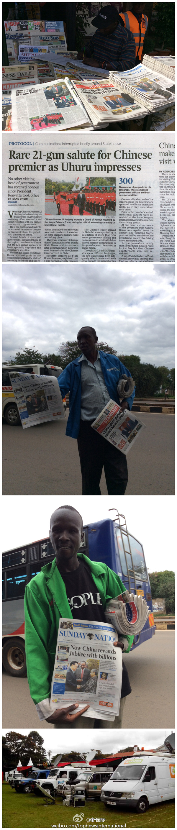 ????新華網(wǎng)北京5月11日電? 據(jù)新華社“新國(guó)際”微博報(bào)道,連日來(lái),肯尼亞各大媒體紛紛對(duì)李克強(qiáng)總理訪肯進(jìn)行全方位報(bào)道。主要報(bào)紙均在頭版頭條大篇幅介紹訪問(wèn)情況,并開辟專版引述李總理講話對(duì)肯中關(guān)系進(jìn)行述評(píng)??先箅娨暸_(tái)現(xiàn)場(chǎng)直播李總理和肯雅塔總統(tǒng)會(huì)見記者實(shí)況。肯媒體還高度評(píng)價(jià)中國(guó)在文化教育等領(lǐng)域的軟實(shí)力外交。