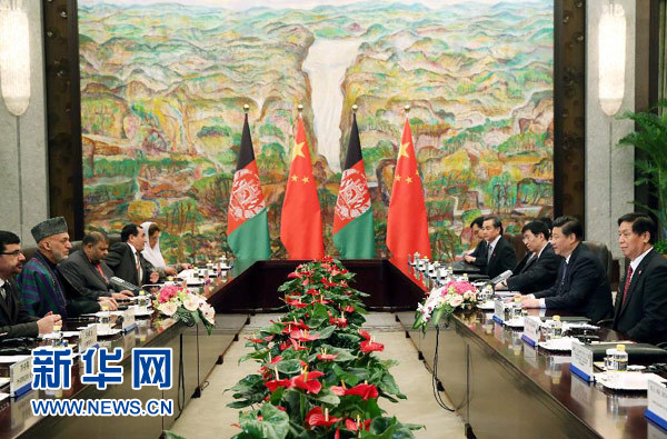 ????卡爾扎伊表示,阿中兩國(guó)有著兄弟般深厚的友誼,中國(guó)是阿富汗信賴的好鄰居。阿方感謝中方給予阿富汗和平重建的寶貴支持。無(wú)論阿富汗大選結(jié)果如何,阿方?jīng)Q心同中方發(fā)展親密的睦鄰友好關(guān)系,希望中方繼續(xù)幫助阿富汗實(shí)現(xiàn)穩(wěn)定、和解、發(fā)展,幫助阿富汗培訓(xùn)各類人才??植乐髁x、跨國(guó)犯罪是阿中兩國(guó)共同的敵人,阿方愿同中方合力打擊。