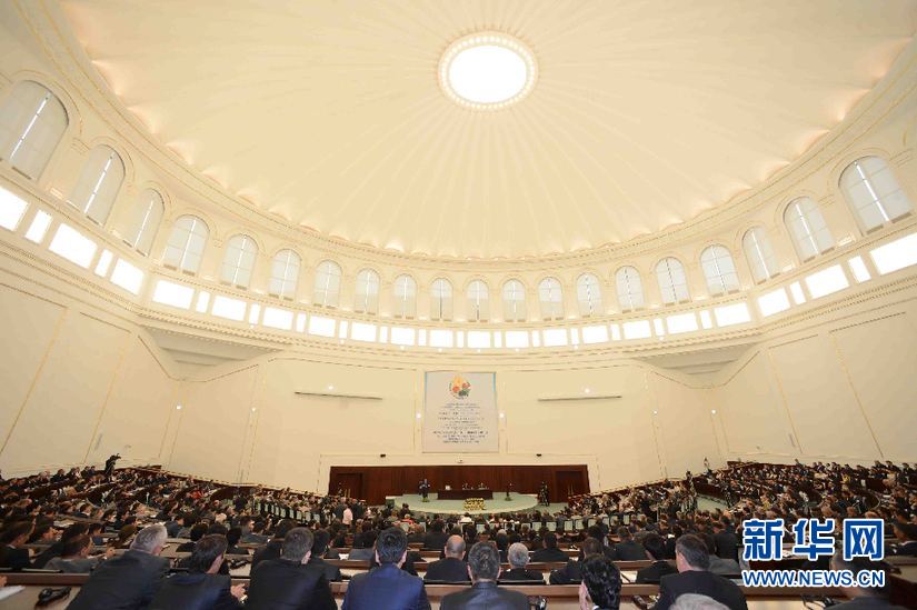 ????6月6日,在烏茲別克斯坦首都塔什干國際會(huì)議宮,會(huì)議現(xiàn)場(chǎng)。(沙達(dá)提 攝)