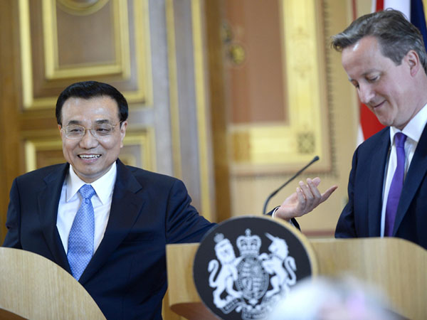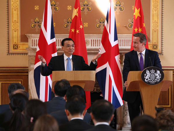 ????在頗有古典特色的英國外交部大樓內,中國國務院總理李克強與英國首相共同見證了兩國間一系列合作文件的簽署。