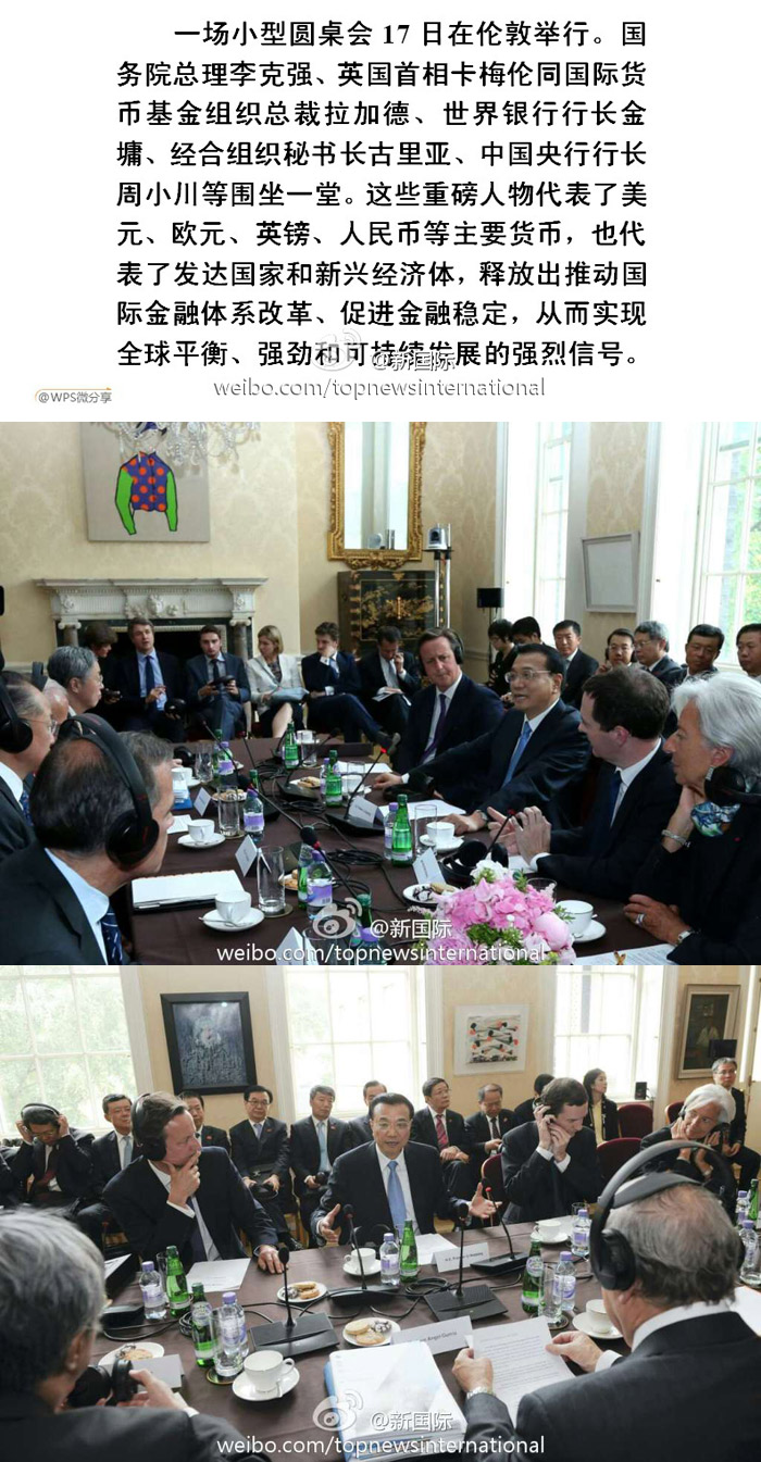 ??? 新華網(wǎng)北京6月18日電 據(jù)新華社“新國(guó)際”微博報(bào)道。一場(chǎng)小型圓桌會(huì)17日在倫敦舉行。國(guó)務(wù)院總理李克強(qiáng)、英國(guó)首相卡梅倫同國(guó)際貨幣基金組織總裁拉加德、世界銀行行長(zhǎng)金墉、經(jīng)合組織秘書(shū)長(zhǎng)古里亞、中國(guó)央行行長(zhǎng)周小川等圍坐一堂。