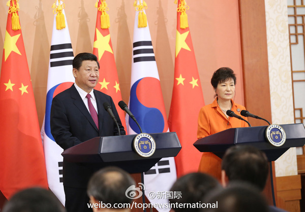 ??? 新華網(wǎng)北京7月4日電 據(jù)新華社“新國(guó)際”微博報(bào)道,習(xí)近平主席3日在同韓國(guó)總統(tǒng)樸槿惠會(huì)談后共見記者時(shí)說,我和樸槿惠總統(tǒng)都認(rèn)為,中韓兩國(guó)應(yīng)一道努力,成為實(shí)現(xiàn)共同發(fā)展的伙伴、致力地區(qū)和平的伙伴、攜手振興亞洲的伙伴、促進(jìn)世界繁榮的伙伴。