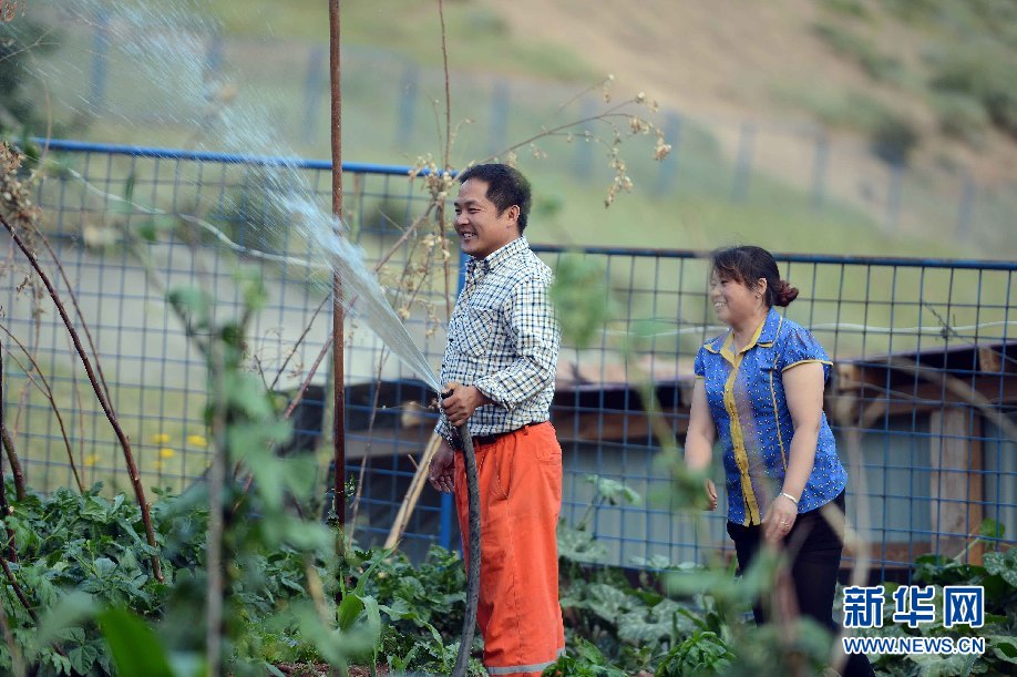 ????7月5日,烏茲別克斯坦安革連至琶布鐵路隧道項(xiàng)目安革連隧道進(jìn)口西口分部生活區(qū),楊清海在澆水。(沙達(dá)提 攝)