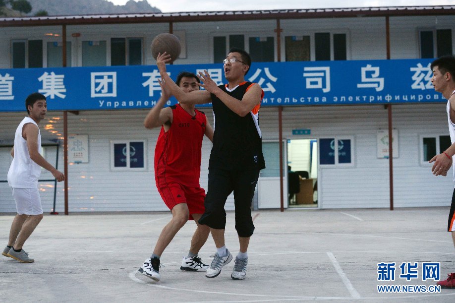 ????7月5日,烏茲別克斯坦安革連至琶布鐵路隧道項目安革連隧道進口西口分部,員工在打籃球。(沙達提 攝)
