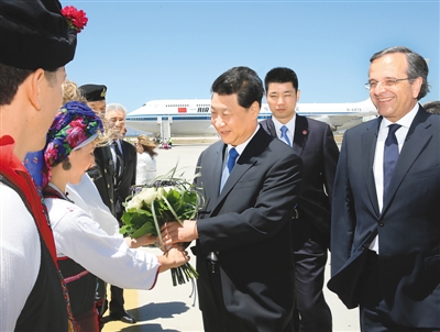 習(xí)近平抵達(dá)羅德島迪亞哥拉斯機(jī)場(chǎng)時(shí),希臘總理薩馬拉斯專程從首都雅典前來(lái),并率多名內(nèi)閣部長(zhǎng)和羅德市市長(zhǎng)到機(jī)場(chǎng)歡迎。習(xí)近平在舷梯旁同薩馬拉斯握手,互致問(wèn)候。身著當(dāng)?shù)貍鹘y(tǒng)服裝的希臘青年向習(xí)近平獻(xiàn)花。希臘禮兵沿紅地毯兩側(cè)列隊(duì),向習(xí)近平行注目禮。
