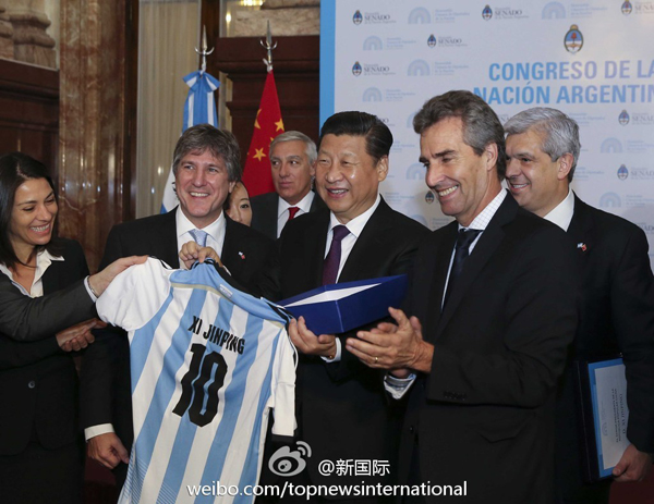 ????新華網(wǎng)北京7月20電 據(jù)新華社“新國(guó)際”微博報(bào)道,正在阿根廷進(jìn)行國(guó)事訪問(wèn)的國(guó)家主席習(xí)近平當(dāng)?shù)貢r(shí)間19日上午會(huì)見了副總統(tǒng)兼參議長(zhǎng)布杜和眾議長(zhǎng)多明格斯。會(huì)見后,布杜向習(xí)近平主席贈(zèng)送了阿根廷國(guó)家足球隊(duì)10號(hào)球衣。在剛結(jié)束的世界杯比賽中,阿根廷國(guó)家隊(duì)10號(hào)球員為梅西。