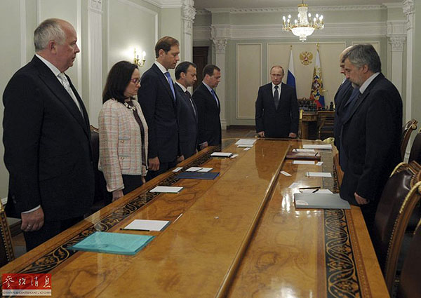 7月17日夜,在俄羅斯莫斯科州新奧加廖沃官邸,俄羅斯總統(tǒng)普京(后)和一些高級別官員在經(jīng)濟問題會議前為墜毀馬航MH17航班的遇難者默哀。普京當晚說,馬航客機失事悲劇發(fā)生在烏克蘭領(lǐng)空,烏克蘭無疑對此承擔責任。