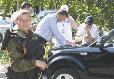 7月30日,烏克蘭頓涅茨克,歐安組織調(diào)查人員看地圖分析周?chē)踩蝿?shì)。由于烏內(nèi)戰(zhàn)仍在繼續(xù),調(diào)查人員已經(jīng)連續(xù)4天未能進(jìn)入MH17墜機(jī)現(xiàn)場(chǎng)。