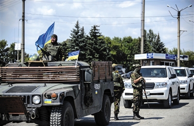 7月31日,烏克蘭政府軍車護(hù)送專家組車隊(duì)進(jìn)入墜機(jī)現(xiàn)場。