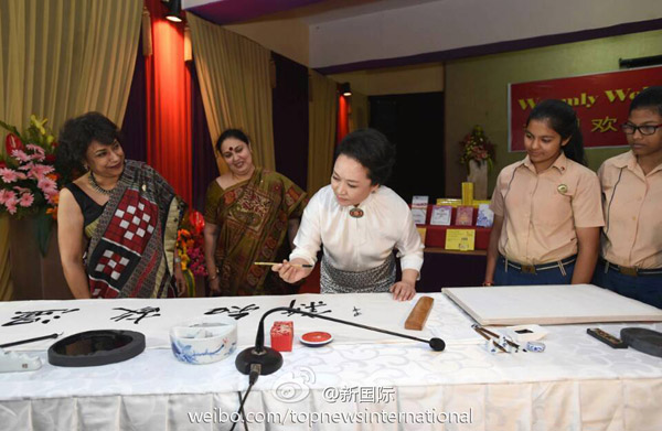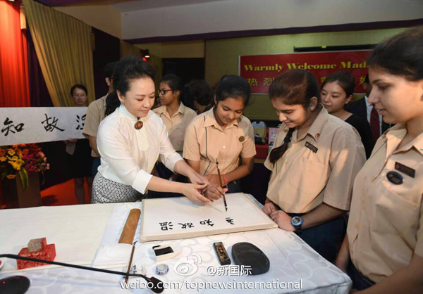 ????新華網(wǎng)北京9月18日電 據(jù)新華社“新國際”微博報(bào)道,習(xí)近平主席夫人彭麗媛18日上午在新德里參觀泰戈?duì)枃H學(xué)校時(shí),用毛筆書寫成語“溫故知新”,并簽名蓋上印章。她對師生們逐字講解后說,我們要經(jīng)常溫習(xí)學(xué)過的知識,不斷學(xué)習(xí)掌握新知識,開拓創(chuàng)新,與時(shí)俱進(jìn)。希望同學(xué)們認(rèn)真學(xué)習(xí),更好報(bào)效祖國,祝你們成功。