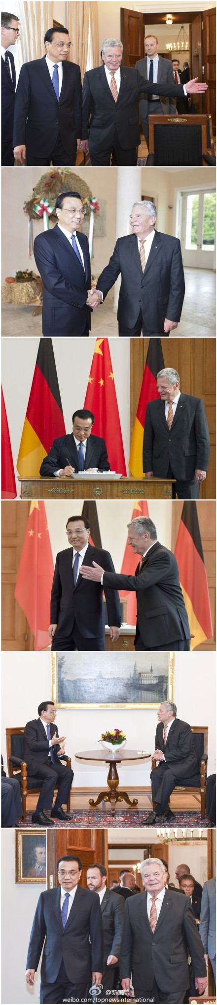 ????新華網(wǎng)北京10月10日電 據(jù)新華社“新國際”微博報(bào)道,10月10日上午,國務(wù)院總理李克強(qiáng)在柏林會(huì)見德國總統(tǒng)高克。李克強(qiáng)說,在中德雙方的共同努力下,兩國合作的深度和廣度達(dá)到前所未有的水平。中方愿同德方一道,充分理解對(duì)方國情,筑牢中德友好的基石,開辟兩國全方位戰(zhàn)略伙伴關(guān)系更加美好的前景。