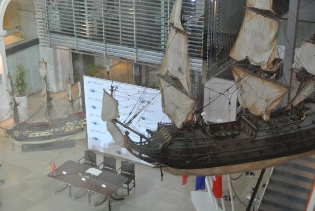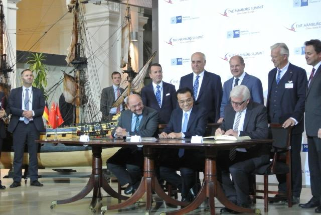 在中歐論壇漢堡峰會(huì)第六屆會(huì)議的舉行地漢堡商會(huì)的簽字大廳里,放著一艘帆船模型。天花板上也懸掛了很多船只模型。
