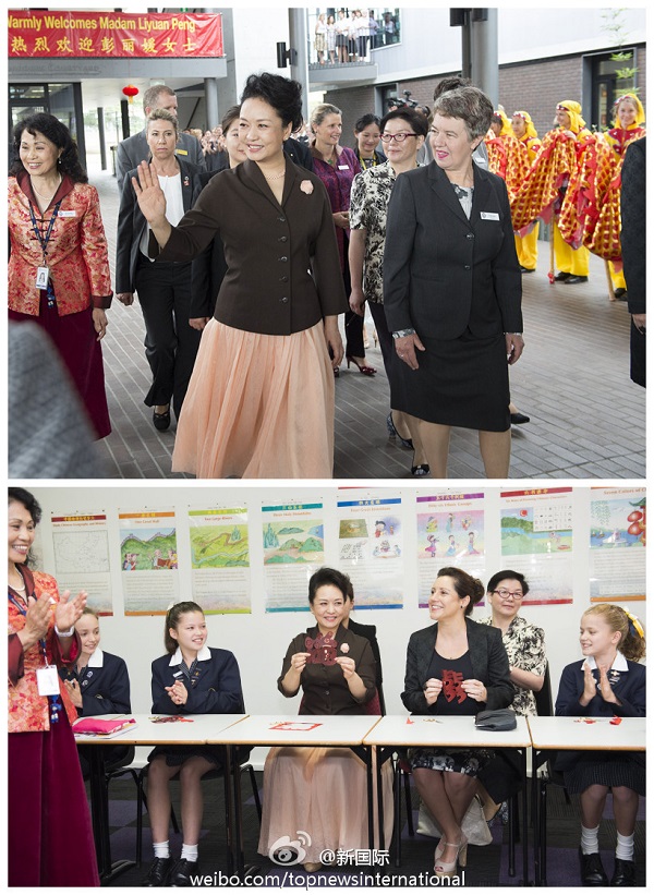 ??? 新華網(wǎng)北京11月19日電 據(jù)新華社“新國(guó)際”微博報(bào)道,習(xí)近平主席夫人彭麗媛19日在悉尼參觀育文武女子學(xué)校,在舞龍隊(duì)引導(dǎo)下來(lái)到孔子課堂?!鞍兹找郎奖M……”16名女孩朗誦《登鸛雀樓》,還學(xué)打中國(guó)結(jié)、制作剪紙、繡織漢字“中澳友誼長(zhǎng)存”。彭麗媛拿起剪刀,剪出一個(gè)“?!弊?。?