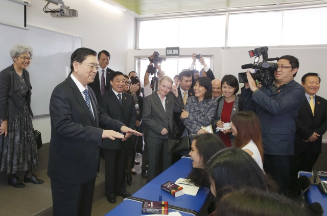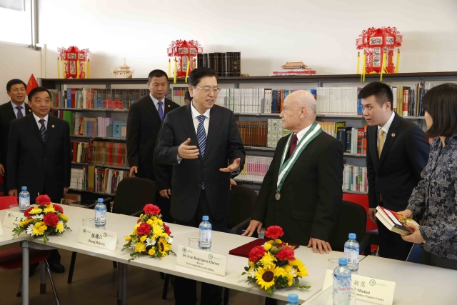 ??? 校長羅德里格斯向張德江介紹了這所孔子學(xué)院成立4年多來的發(fā)展情況,并向張德江贈書。