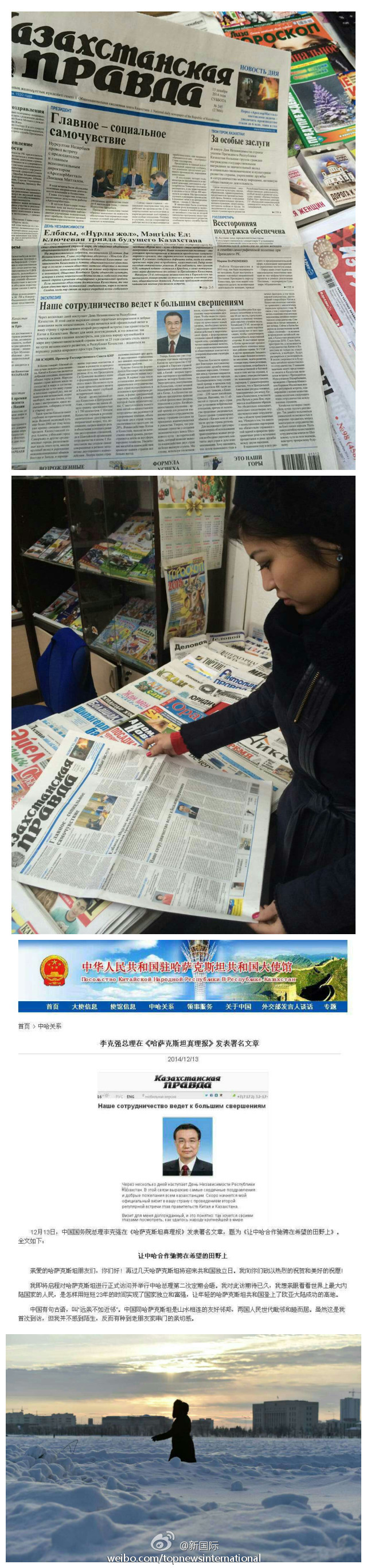 ????新華網(wǎng)北京12月13日電? 據(jù)新華社“新國際”微博報道,哈薩克斯坦真理報13日頭版刊登李克強總理訪前發(fā)表的署名文章《讓中哈合作馳騁在希望的田野上》??偫肀硎?,中哈是友好鄰邦,歷史淵源深厚,戰(zhàn)略互信不斷加深,利益融合愈加緊密,他對中哈合作未來充滿信心。李克強還就即將到來的哈薩克斯坦獨立日向當(dāng)?shù)孛癖娭乱宰YR和祝愿。