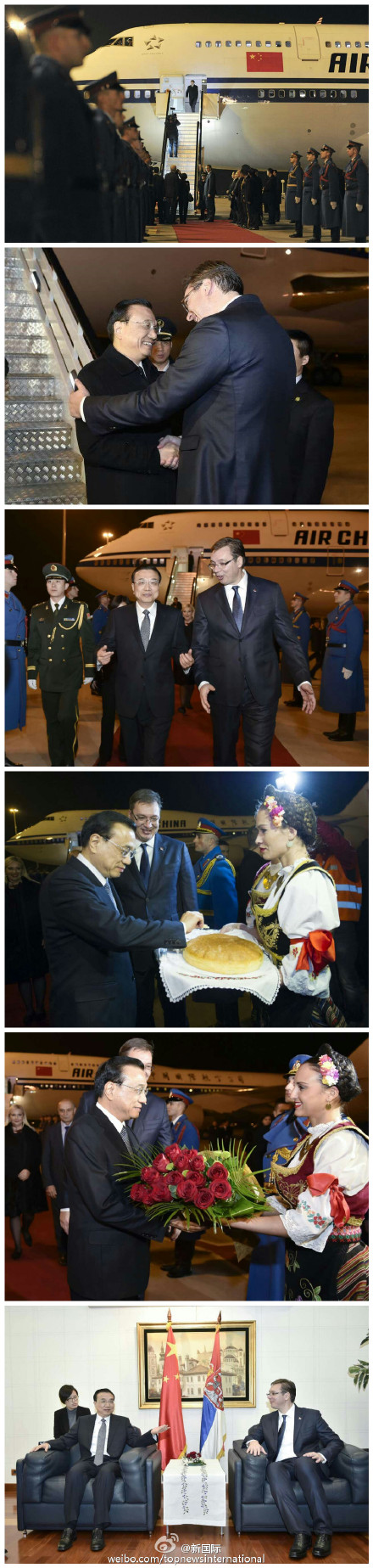 ??? 新華網(wǎng)北京12月16日電 據(jù)新華社“新國際”微博報道,當(dāng)?shù)貢r間15日晚,李克強(qiáng)總理乘專機(jī)抵達(dá)塞爾維亞首都貝爾格萊德,出席中國-中東歐領(lǐng)導(dǎo)人會晤并正式訪塞,塞總理武契奇率兩位副總理及多位部長到機(jī)場迎接,塞女青年按照迎接貴賓的傳統(tǒng)禮儀獻(xiàn)上面包和鹽請他品嘗。兩國總理在機(jī)場進(jìn)行了親切會見。