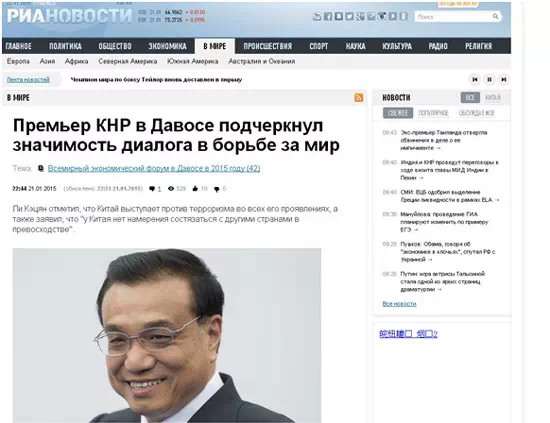 俄新社21日以《中國(guó)總理強(qiáng)調(diào)以對(duì)話促進(jìn)和平的重要性》為題報(bào)道了李克強(qiáng)總理在達(dá)沃斯論壇上的致辭。報(bào)道中援引了李克強(qiáng)“世界各國(guó)都要像愛(ài)護(hù)自己的眼睛一樣愛(ài)護(hù)和平”的說(shuō)法,并指出,中國(guó)反對(duì)一切形式的恐怖主義。文章寫(xiě)道,今年是世界反法西斯戰(zhàn)爭(zhēng)勝利70周年,李克強(qiáng)強(qiáng)調(diào)了維護(hù)戰(zhàn)后國(guó)際秩序的重要性。