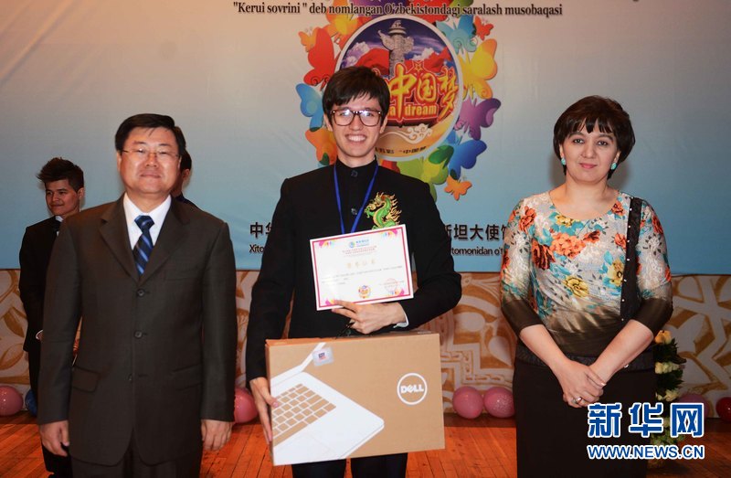 4月28日,在烏內(nèi)務(wù)部文化宮禮堂,來自撒馬爾罕國(guó)立外國(guó)語(yǔ)學(xué)院的扎爾卡毛(中文名:康曉鑫)獲得特等獎(jiǎng)。新華網(wǎng)記者 沙達(dá)提攝