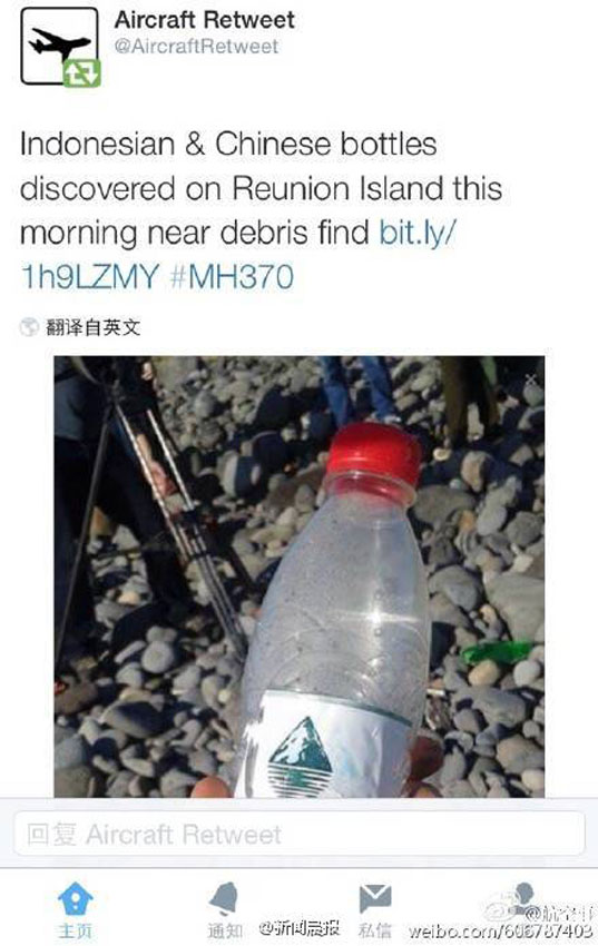 疑似MH370殘骸附近發(fā)現(xiàn)農(nóng)夫山泉水瓶。