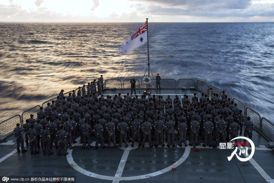 從南中國海、馬六甲海峽,再到南印度洋。馬航MH370的搜救工作可謂是一波三折。2014年4月26日,參加馬航失聯(lián)航班搜尋的澳大利亞海軍士兵參加澳紐軍團日黎明升旗儀式。