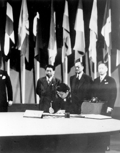 ??? 1945年10月24日,《聯(lián)合國(guó)憲章》經(jīng)安全理事會(huì)的5個(gè)常任理事國(guó)以及其他簽字國(guó)過半數(shù)批準(zhǔn),開始正式生效。聯(lián)合國(guó)作為第二次世界大戰(zhàn)之后最大的國(guó)際性組織正式成立。此后,這一天被定為聯(lián)合國(guó)日。圖為中國(guó)代表團(tuán)成員吳貽芳(前)在憲章上簽字。 新華社發(fā)