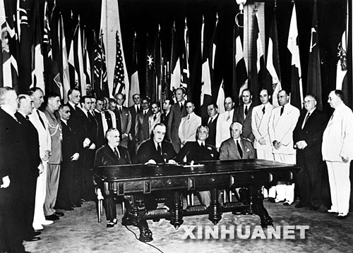 這是1942年1月1日,中、美、英、蘇等26國(guó)代表在華盛頓簽署《聯(lián)合國(guó)宣言》。 新華社發(fā)