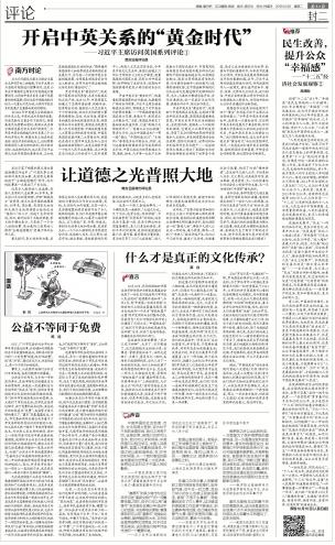 英國駐華大使吳百納連續(xù)用了四個“黃金”來形容習近平主席此次訪英的意義:“今年是中英關(guān)系的黃金年,這將是一次黃金訪問,它證明中英關(guān)系的發(fā)展處于黃金時期。訪問將確立中英面向21世紀的全球伙伴關(guān)系,開啟中英關(guān)系史上的黃金10年。”我們期待并相信,這次為開啟中英關(guān)系“黃金時代”而往的里程碑式訪問,一定能成功打造中英關(guān)系新格局、繪制兩國關(guān)系新藍圖、開辟務實合作新前景、樹立國際合作新典范。(南方日報評論員)