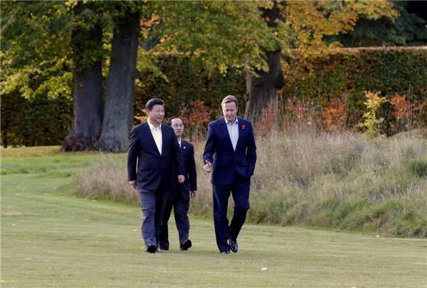 傍晚時分,習(xí)近平主席來到距倫敦市區(qū)約1小時車程的契克斯首相鄉(xiāng)間別墅,同卡梅倫一起散步,并舉行小范圍會晤。