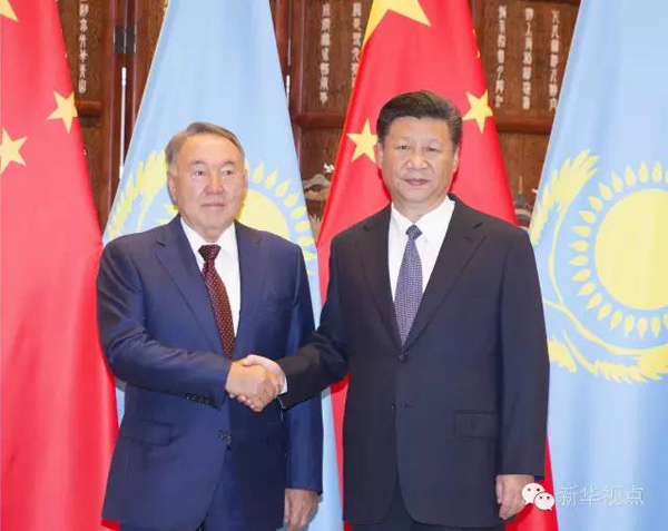 (國家主席習(xí)近平同哈薩克斯坦總統(tǒng)納扎爾巴耶夫舉行會談。新華社記者丁林 攝)