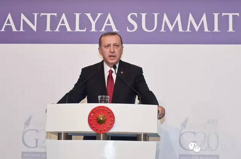 ??? 2015年11月,G20峰會在土耳其安塔利亞舉行,從安塔利亞到杭州,從地中海岸到錢塘江畔,與東道主接力棒一樣順利傳遞的,是對推動全球經(jīng)濟穩(wěn)步復(fù)蘇、實現(xiàn)可持續(xù)增長的決心?!敖影簟焙蟮闹袊?,在議題設(shè)置上既汲取了安塔利亞峰會的智慧成果,又著眼當(dāng)前、旨在長遠、彰顯新意。 2015年G20安塔利亞峰會上的埃爾多安總統(tǒng)↓