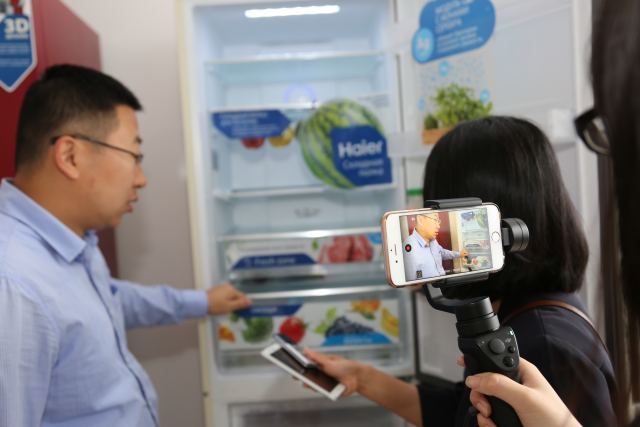 海爾在俄羅斯韃靼斯坦共和國(guó)的冰箱工廠(chǎng)內(nèi),海爾員工介紹冰箱功能。(新華社記者趙宇攝)